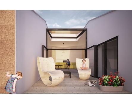 Poszukując wydajnego systemu okładzinowego, elewację pokryto panelami korkowymi. Świadome rozmieszczenie zieleni chroni przed zmianami czynników pogodowych, zarówno latem, jak i zimą. Rośliny iglaste, posadzone od strony północnej zatrzymują zimny wiatr, zaś drzewa liściaste rosnące na południe zapobiegają nadmiernemu nagrzewaniu domu. Istotnym rozwiązaniem pasywnym jest sposób przepływu powietrza. "Dzięki formie budynku bardzo skuteczna jest naturalna wentylacja. Natomiast z architektonicznego punktu widzenia najważniejszy jest prorodzinny charakter domu" - podsumowuje Krajewska.
