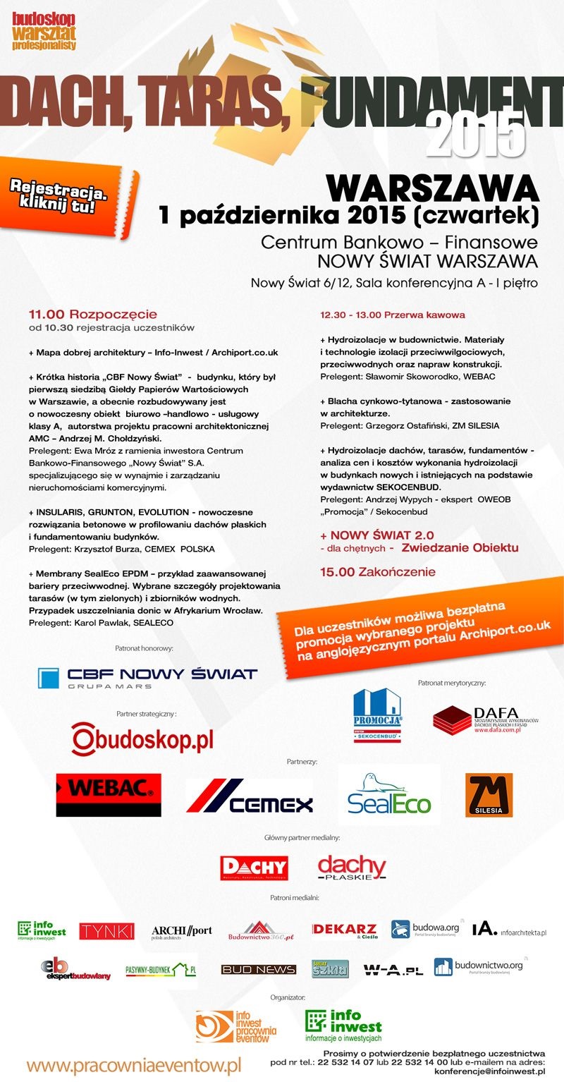 Rejestracja: http://www.infoinwest.pl/konferencje/dach_taras_fundament/2015/warszawa/