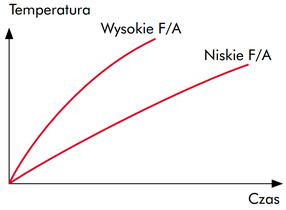 W obu przypadkach możemy mówić o praktycznie tych samych prawidłowościach. Profil stalowy o dużej powierzchni otrzymuje więcej ciepła, niż profil o mniejszej powierzchni, a im większa objętość profilu i im większy przekrój kształtownika stalowego, tym większe jest rozpraszanie ciepła oraz lepsza odporność ogniowa całej konstrukcji. Mały i gruby profil będzie miał zatem wolniejszy przyrost temperatury, niż profil duży i cienki, który wymaga z kolei grubszej izolacji, aby osiągnąć dane wymagania odporności ogniowej. Wysoki wskaźnik masywności kształtu (F/A) oznacza szybki wzrost temperatury stali. Zależność tę obrazuje poniższy wykres.