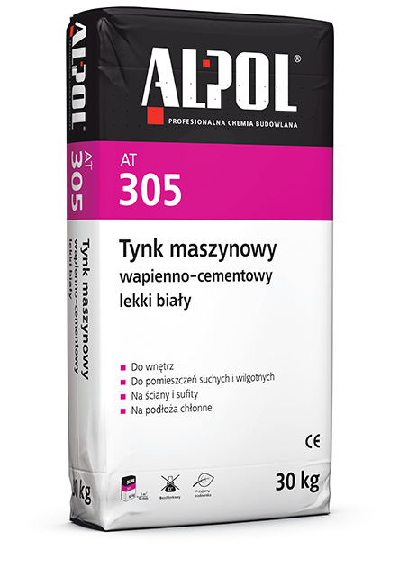 Mury z cegieł i pustaków ceramicznych, silikatowych, bloczków z betonu komórkowego oraz ściany i stropy z betonowych elementów prefabrykowanych. Stare, nie zwietrzałe tynki cementowo-wapienne, tynk podkładowy ALPOL AT 303. Przygotowanie podłoża: Podłoże musi być suche, czyste i nośne oraz wolne od zanieczyszczeń pylastych i tłustych plam. Stare i mocne tynki oczyścić z warstw malarskich, szczeliny poszerzyć, ubytki i nierówności uzupełnić zaprawą szybkowiążącą ALPOL AZ 130 lub wyrównawczą ALPOL AZ 135. Podłoża z ceramiki poryzowanej, betonu prefabrykowanego i szalunków systemowych pomalować gruntem ALPOL AG 702. Ściany z betonu komórkowego oraz z cegieł i bloczków silikatowych nie wymagają wcześniejszego zagruntowania jak również wykonania obrzutki wstępnej. Przed narzuceniem tynku należy je obficie zmoczyć wodą. Na innych podłożach wykonać obrzutkę wstępną tynkiem podkładowym ALPOL AT 303 lub zastosować grunt ALPOL AG 702. Miejsca narażone na powstawanie rys np. sąsiadujące z sobą różne materiały konstrukcyjne, naroża otworów budowlanych itp., należy wzmocnić siatką zbrojącą z włókna szklanego o oczkach 10 mm, zatapiając ją w zaprawie szybkowiążącej ALPOL AZ 130 lub wyrównawczej ALPOL AZ 135. Dane techniczne tynku AT 305: