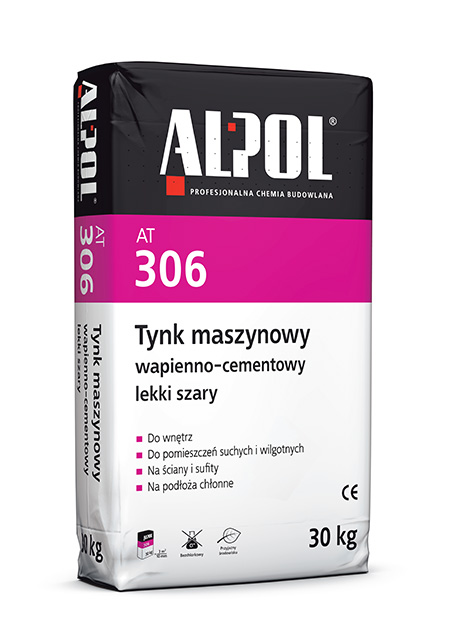 Mury z cegieł i pustaków ceramicznych, silikatowych, bloczków z betonu komórkowego oraz ściany i stropy z betonowych elementów prefabrykowanych. Stare, nie zwietrzałe tynki cementowo-wapienne, tynk podkładowy ALPOL AT 303. Przygotowanie podłoża: Podłoże musi być suche, czyste i nośne oraz wolne od zanieczyszczeń pylastych i tłustych plam. Stare i mocne tynki oczyścić z warstw malarskich, szczeliny poszerzyć, ubytki i nierówności uzupełnić zaprawą szybkowiążącą ALPOL AZ 130 lub wyrównawczą -ALPOL AZ 135. Ściany z betonu komórkowego oraz z cegieł i bloczków silikatowych nie wymagają wcześniejszego zagruntowania jak również wykonania obrzutki wstępnej. Przed narzuceniem tynku należy je obficie zmoczyć wodą. Na innych podłożach wykonać obrzutkę wstępną tynkiem podkładowym ALPOL AT 303 lub zastosować grunt ALPOL AG 702. Miejsca narażone na powstawanie rys np. sąsiadujące z sobą różne materiały konstrukcyjne, naroża otworów budowlanych itp., należy wzmocnić siatką zbrojącą z włókna szklanego o oczkach 10 mm., zatapiając ją w zaprawie szybkowiążącej ALPOL AZ 130 lub wyrównawczej ALPOL AZ 135. Dane techniczne tynku AT 306: