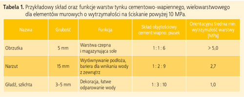 Z punktu widzenia nakładu pracy oraz zużycia materiałów wydawać by się mogło, że tynki cienkowarstwowe mają zdecydowaną przewagę nad wielowarstwowymi. Okazuje się jednak, że w dawnych czasach istniały już możliwości techniczne pozwalające wytwarzać tynki cienkowarstwowe. Ta technologia nie stała się jednak dominującą. Dlaczego? Otóż, po pierwsze, grubą warstwę tynku trudniej jest uszkodzić niż cienką, po drugie w tynkach wielowarstwowych zawarta jest myśl techniczna, która również dzisiaj, z powodzeniem wykorzystywana jest we współczesnych systemach renowacyjnych. Każda z warstw w układzie trójwarstwowym pełni specjalną funkcję (Tabela 1). Wytrzymałość obrzutki powinna być tak dobrana, aby jej wytrzymałość na ściskanie nie przekraczała wytrzymałości podłoża. Wniosek z tego jest taki, że dla materiałów bardziej porowatych, mniej wytrzymałych należy zwiększać ilość wapna w obrzutce, a dla podłoży takich jak beton, ilość wapna może być mniejsza. W okresach letnich należy zwiększyć zawartość wapna, gdyż posiada ono naturalne właściwości utrzymywania wody w zaprawie. Ta jego cecha szczególnie jest przydatna przy pracach w wysokich temperaturach, gdy parowanie wody jest większe niż zazwyczaj. Utrzymanie urabialności zaprawy na odpowiednim poziomie gwarantuje uzyskanie optymalnej przyczepności tynku do podłoża.