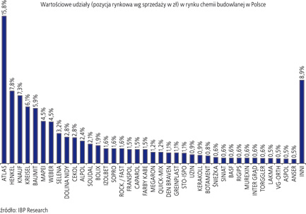 Zdecydowanym liderem rynku chemii budowlanej w Polsce jest Atlas z 16,5%-owym udziałem ilościowym i 15,8%-owym udziałem wartościowym (sam Atlas, bez firm/marek z Grupy takich jak: Dolina Nidy, Nowy Ląd, Izohan, Izolmat, WiM). Na drugim miejscu pod względem ilościowym plasuje się Knauf (9,9%) a pod względem wartości sprzedaży Henkel (7,8%). Pierwsza piątka producentów zaspokaja 50% tonażu zapotrzebowania rynku. Są to firmy: Atlas, Knauf, Baumit, Henkel i Kreisel. Kolejna piątka producentów sprzedaje dalsze 20% – są to: Dolina Nidy, Weber, Mapei (bez Sopro), Cekol i Alpol. Pod względem wartości sprzedaży do wymienionych najważniejszych producentów należy jeszcze dodać firmę Selena (główna marka Tytan), której udział wartościowy 3-krotnie przewyższa ilościowy, a to z racji operowania na rynkach relatywnie drogich produktów (silikony budowlane, piany montażowe).